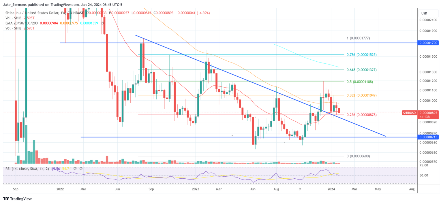 Moving to the technical analysis of Shiba Inu price action, the weekly chart reveals some critical insights. The chart below shows the SHIB/USD pair on a weekly time frame and provides a broad view of market sentiment and price trends.