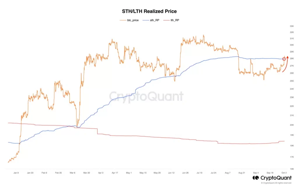 Bitcoins [BTC] Short-Term Holder Realized Price (STH RP) rose above the coin’s price for the first time since June during the intraday trading session on October 2, as the leading coin broke the key resistance at $27,800 to exchange hands at $28,500, data by CryptoQuant showed.