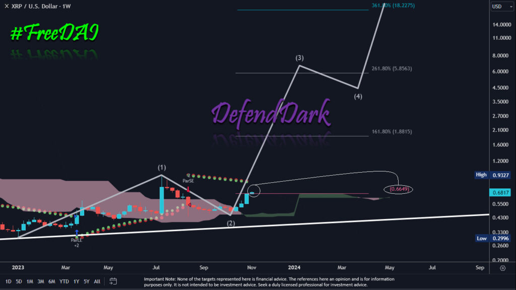 The chart indicates that XRP is currently in an Elliott Wave pattern, a structure consisting of impulse and correction waves. The impulse waves, labeled 1, 3, and 5, move in the direction of the trend, while the correction waves, labeled 2 and 4, move against it. Dark Defender’s analysis suggests that XRP has completed its wave 1 and wave 2, with wave 1 marked by a sharp price increase and wave 2 marking a retracement.