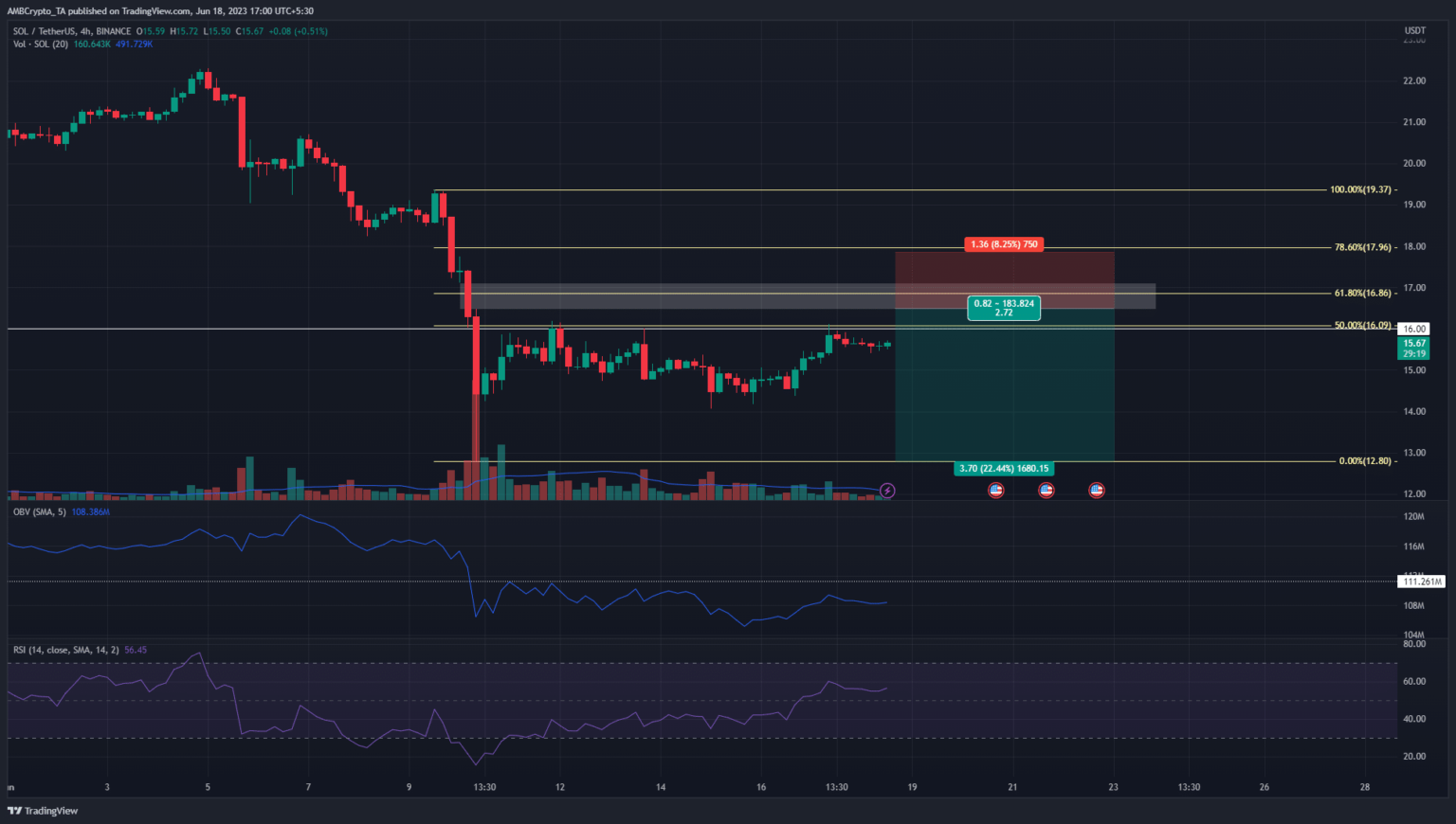 At the time of writing, the price was stuck below the 50% Fibonacci retracement level and trading volume was low. This pointed to sidelined market participants waiting for a direction to be established. The RSI stood at 56 to show upward momentum for SOL, but the OBV was unable to break above a significant resistance level.