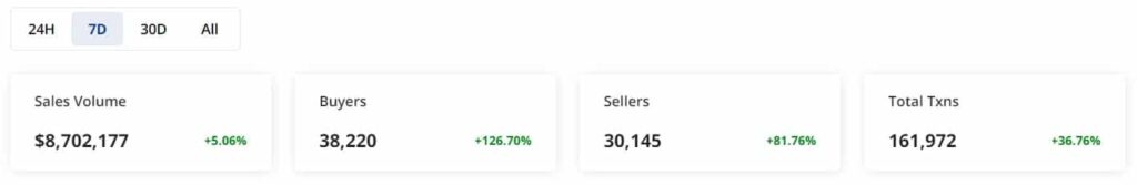 CRYPTOSLAMs facts revealed that the number of NFT buyers has increased by more than 125% in the past seven days, while the number of sellers has increased by 81%. As a result, Solana NFT’s total transactions and sales volume also increased by 36% and 5%, respectively.