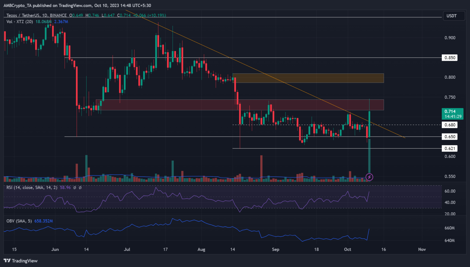 Tezos [XTZ] was in for a surprise pump on October 10, up +10% in less than 24 hours before press time. The bullish momentum broke through crucial long-term trendline resistance. But the rally hit a new hurdle at $0.700.