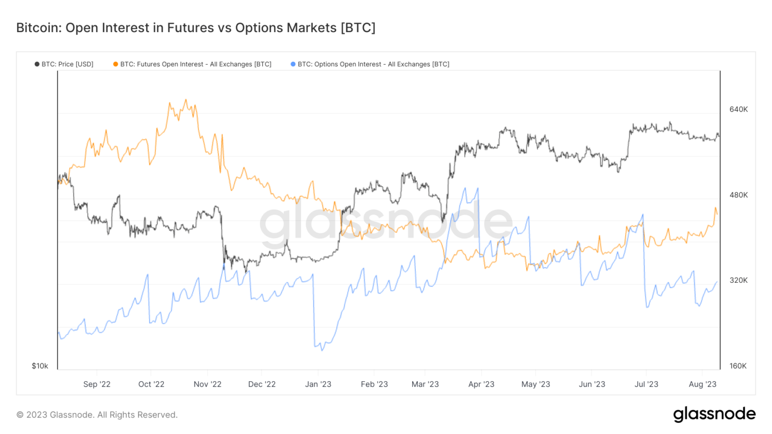 The open interest on Bitcoin futures is currently 420,000 BTC, while the open interest on Bitcoin options is 312,000 BTC.