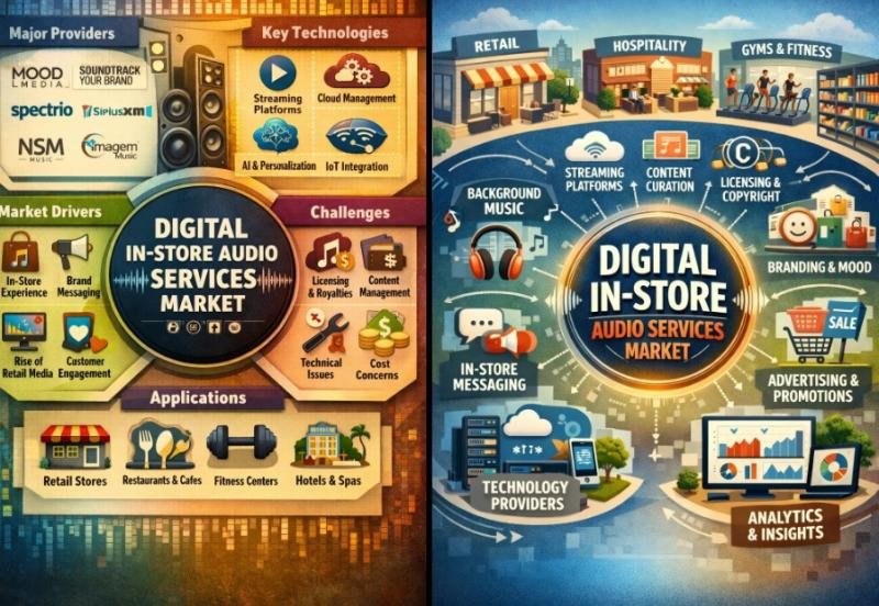 Definition: The digital in-store audio services market includes cloud-based and managed audio solutions designed to deliver music, announcements, promotions and brand messaging within physical retail and commercial spaces. These services include content licensing, playlist management, scheduling software, AI-powered audience targeting, and integration with point-of-sale or customer analytics systems. Retailers, hospitality venues, shopping centers and corporate offices use digital audio in-store to improve customer experience, strengthen brand identity and influence purchasing behavior. Market growth is driven by omnichannel retail strategies, demand for personalized in-store engagement and developments in digital signage and audio streaming technologies. Compliance with music licensing regulations and seamless management of multiple locations are crucial competitive factors in this market.