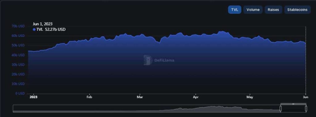 At the time of publication, assets worth $52.27 billion had been deposited into smart contracts of various protocols. This represents a decrease of 19% from the annual peak reached in mid-April.