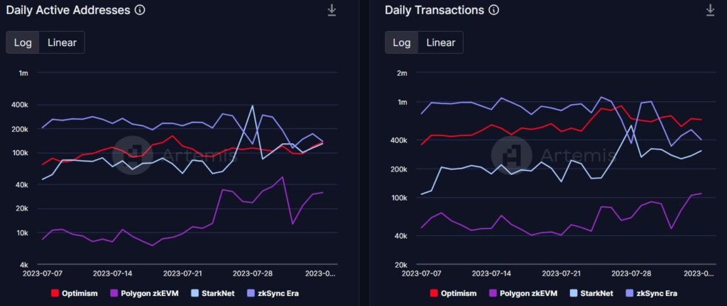 Deebs DeFi, a popular Twitter handle that publishes on-chain insights into crypto currencies, recently posted a tweet highlighting Starknet’s achievements. The tweet pointed out that the rollup surpassed Optimism and ZkSync Era in terms of daily active addresses. This happened when the rollup’s daily active addresses hit the 400,000 mark on July 28, 2023.