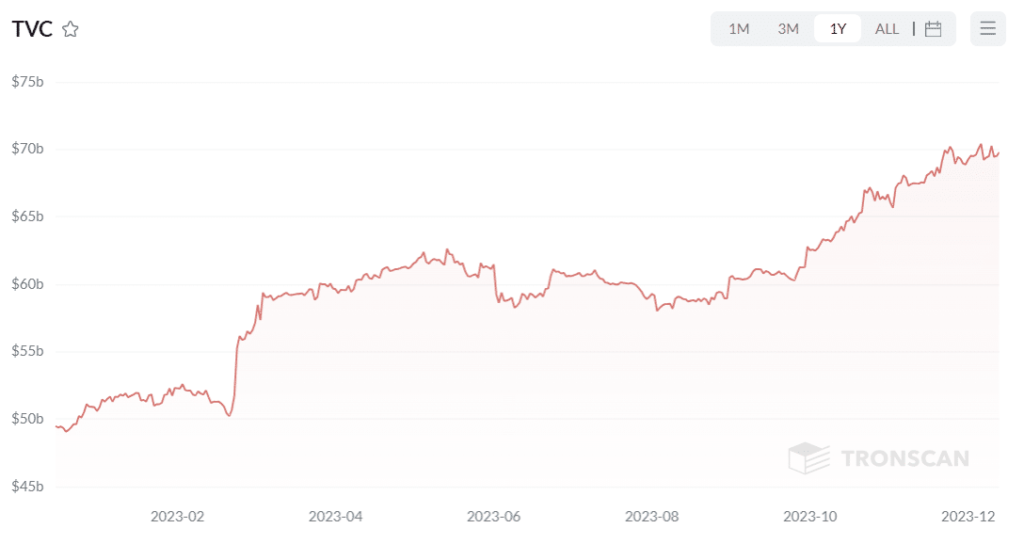- Tron’s total value across the chain also grew consistently through 2023.