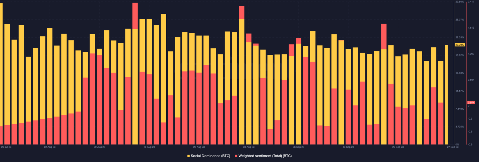 However, social dominance was not alone metric with a change. On September 25, Bitcoin’s weighted sentiment was -0.079. After the development, the metric jumped into the positive region. At the time of writing, the weighted sentiment was 0.074.