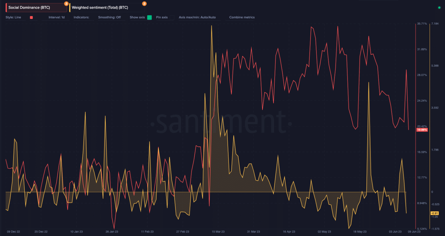 Used as a measure of investor perception of an asset, the Bitcoin weighted sentiment increased to 1.45 on June 6. However, it had fallen to -0.91 at the time of writing, indicating a dip in optimism around the coin.