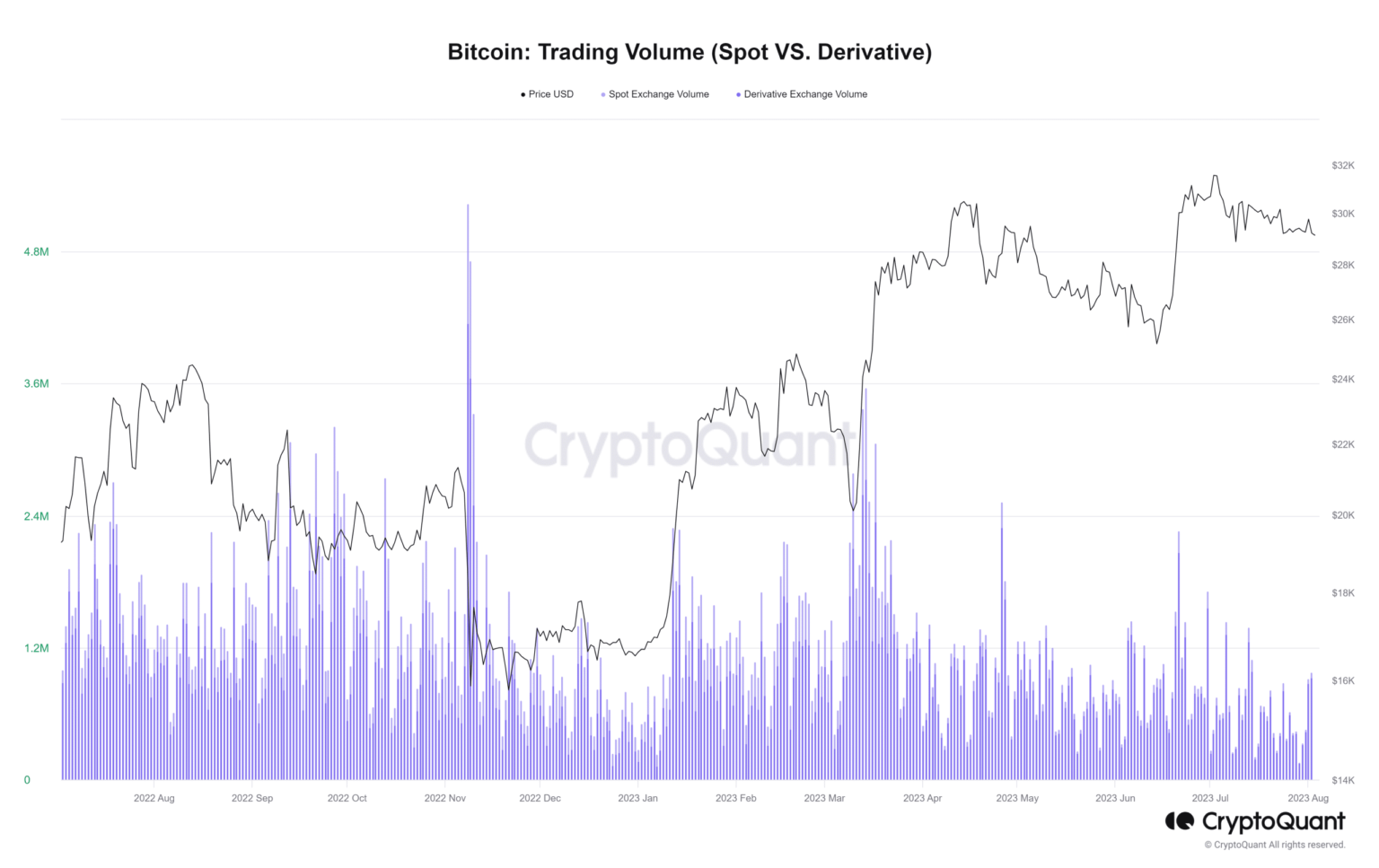 An analysis of these statistics for July showed that they had experienced a decline. Both BTC spot and derivatives trading volumes showed no significant daily spikes compared to previous months, according to CryptoQuant.