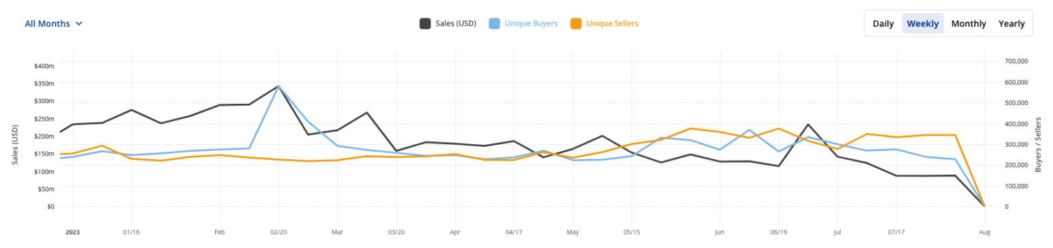 NFT volumes have continued to decline in the ongoing bear market, dropping by nearly half in July.