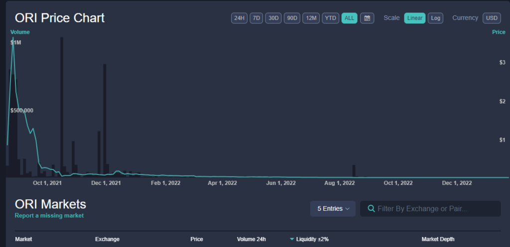 According to information site Cointotem (Initial Coin Offering), Orica held a fundraiser from August 14 to September 14, 2021. The goal was to raise $3.1 million from the sale of its token, ORI. In its ICO, Orica pledged to earmark 50% of Ori’s total supply for “NFT Marketplace Rewards”. 10% would be provided to “advisors and partners”, 15% to the team and 25% sold to investors. At launch, the price of ORI rose to a peak of $3,638 per coin on August 21, 2021 and then dropped to $0.036 on October 1, 2022, based on data from Livecoinwatch.