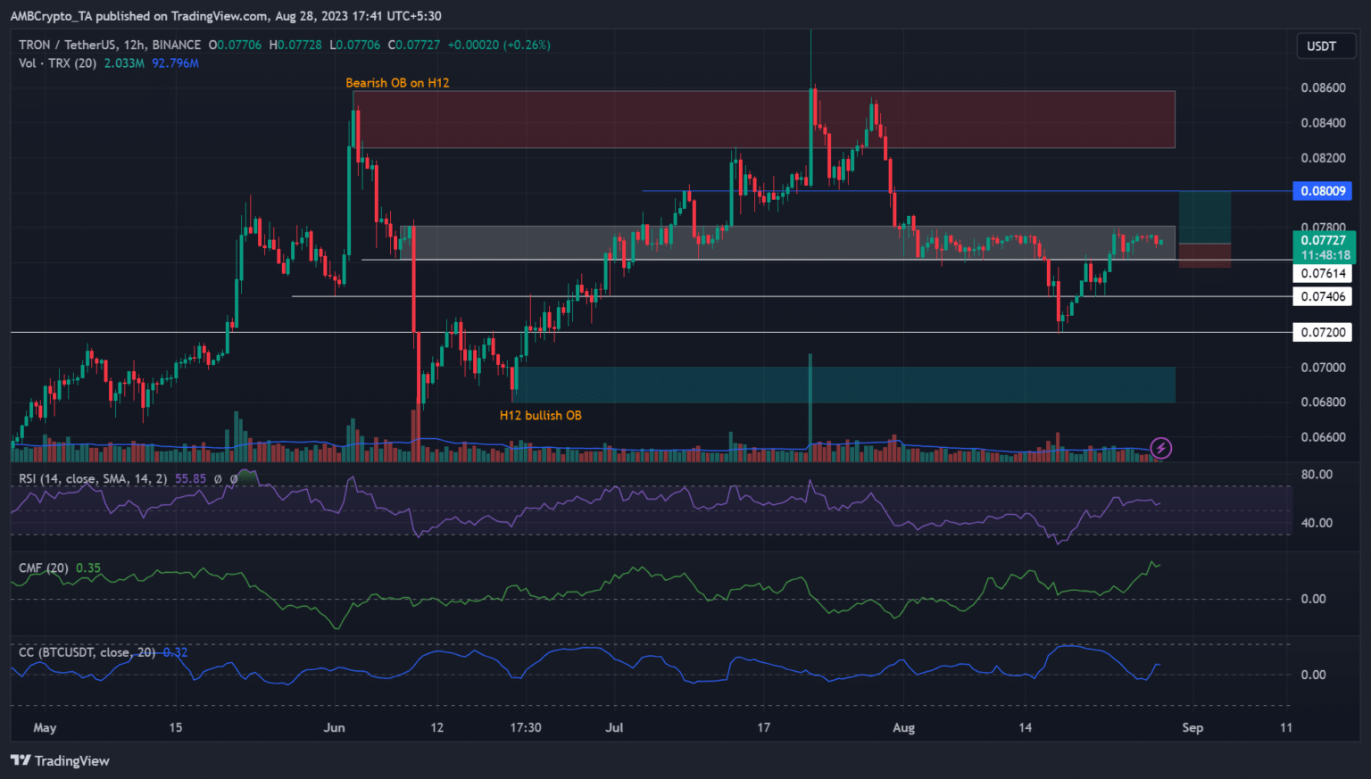 • TRX has reclaimed the previous support from USD 0.076 – USD 0.078.