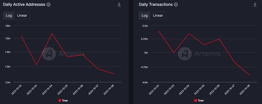 - In addition to TVL, Tron’s daily active addresses and transactions have fallen over the past week.