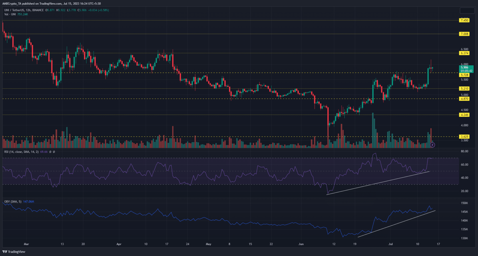 A recent pricing report highlighted the buying opportunity available for Uniswap [UNI] bulls on the higher time frames. This buying opportunity was maxed out by bulls as UNI flipped the $5.72 resistance level to support.