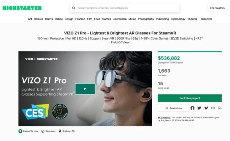 VIZO, the XR brand incubated by TOZO, has surpassed $500,000 in funding on Kickstarter for its first AR glasses, VIZO Z1 Pro [https://www.kickstarter.com/projects/vizo/vizo-x1-pro-the-new-generation-micro-oled-ar-glasses?utm_source=pr&utm_medium=ks&utm_campaign=pr_ks_vizo&utm_term=vizo&utm_content=vizo_20260306]which marks an important milestone as the campaign continues to gain traction. With more than $500,000 pledged and 15 days to go, the project continues to receive strong global support from backers eager to experience next-generation immersive wearable technology.