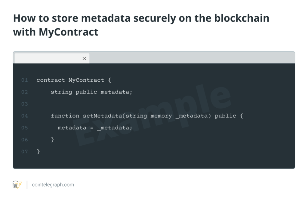 In het bovenstaande voorbeeld heeft het slimme contract genaamd MyContract een publiek leesbare metadatavariabele en beschikt het over een functie genaamd setMetadata waarmee de metadata kan worden bijgewerkt.