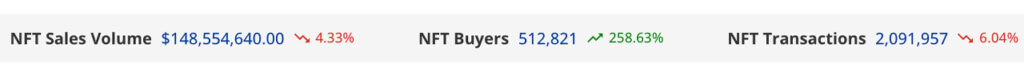 The past week registered $148.55 million in NFT sales, down 4.33% from the previous week. Ethereum-based NFT sales accounted for $88.54 million of the total, representing 59.6% of this week’s total NFT sales, reflecting a 1.41% increase from the previous week . Meanwhile, Bitcoin-based NFTs brought in $25.92 million in sales, about 17.44% of the week’s total, but showed a significant decline of 14.37% from the previous week.
