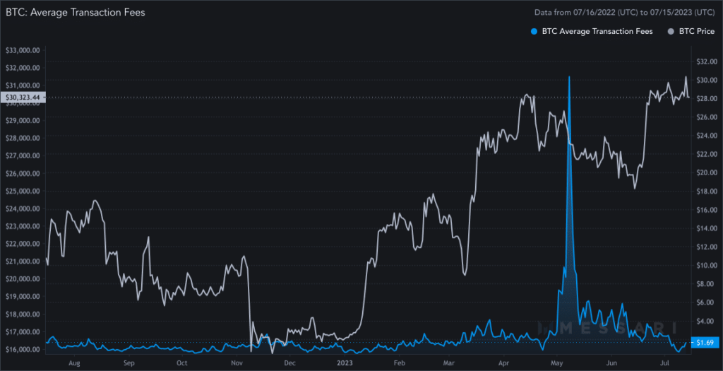 The increase in transaction costs was due to an increase in trading volume on the Bitcoin network when the hype was around Ordinal numbers NFTs collection flooded the market. According to data from Glassnode, an average of nearly 600,500 daily transactions were recorded in May, driving up the cost of using the network.