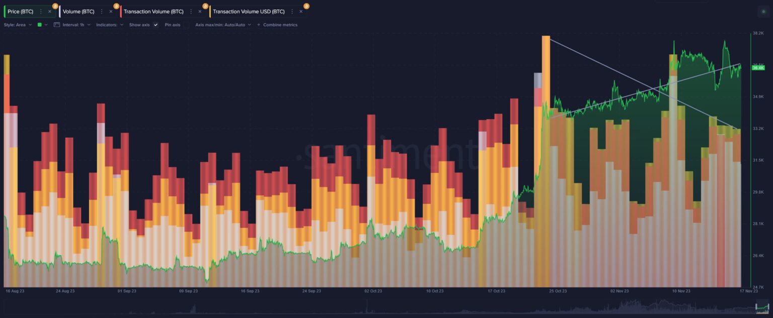 According to Santiment’s report, key wallets holding between 10 and 10,000 BTC have lost 50,882 bitcoins in the past 30 days. Interestingly, after a comfortable increase in transaction volume, the metric started to decline at a time when BTC‘s value continued to rise.