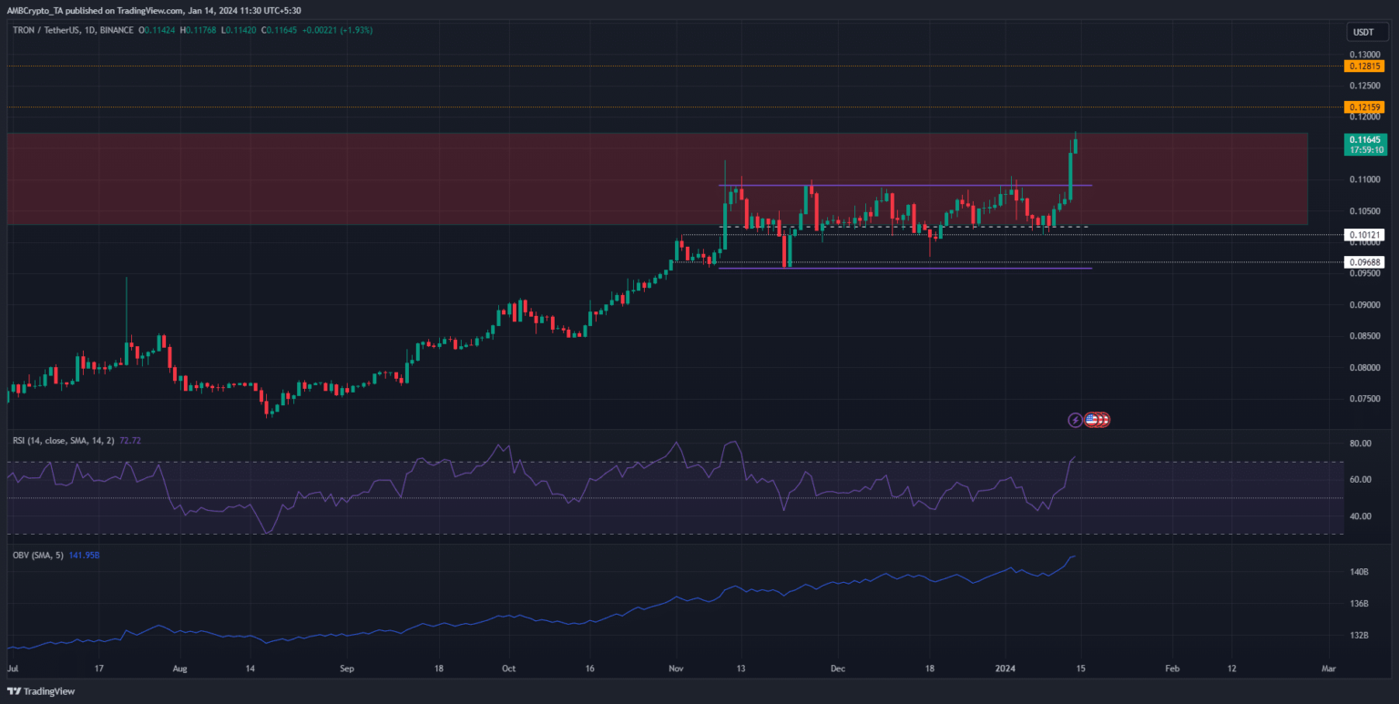 Tron [TRX] has been trading within a certain range since mid-November, but forced an emphatic breakout in the past two days. The price was still within a resistance zone with a higher time frame, but the buyers are much stronger at the moment.