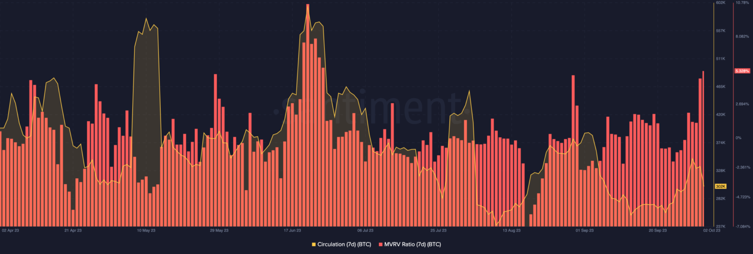 There may be spikes in this statistic assign an increase in short-term selling pressure. So since BTC’s seven-day circulation has fallen, it means the coin may not experience significant selling pressure anytime soon. A continuation of the price increase is therefore possible.