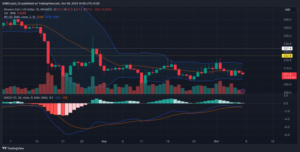 According to CoinMarketCap, BNB was exchanging hands at $211.75 at the time of writing. This was because it lost only 0.89% of its value in the last 24 hours.