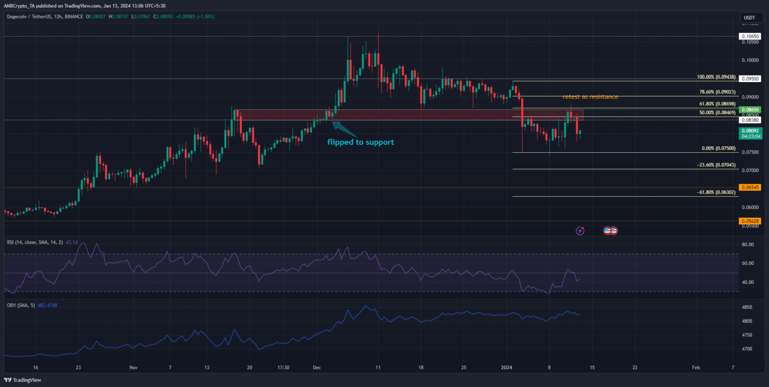 Due to the intense sales on January 3, this region once again became a supply zone. It was tested again on January 11 as resistance. The bulls tried to push prices above $0.087 but failed. The market structure and momentum based on the RSI in the second half of the year showed that the bears were dominant.