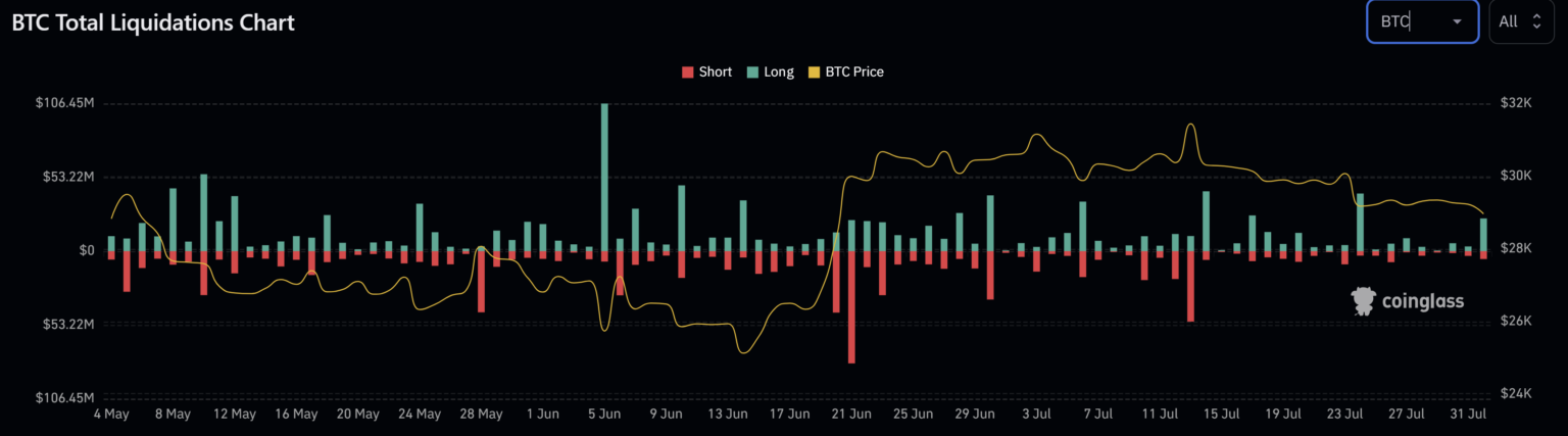 James V. Straten, a renowned on-chain analyst, recently tweeted: “Bitcoin drops below $29,000 as open interest spikes while funding rates go lower. As a result of the biggest long liquidation since 24th July.” As the analyst states, Bitcoin’s price trend can be majorly attributed to long liquidations. The liquidation data from Coinglass indicates that $23.6 million in BTC longs were liquidated, a relatively small amount but significant considering the market’s state.