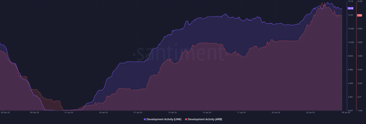 Then continue with AMBCrypto watched in the development activity on both sides. At press time, Santiment data showed that development activity on Arbitrum and Chainlink has grown significantly.