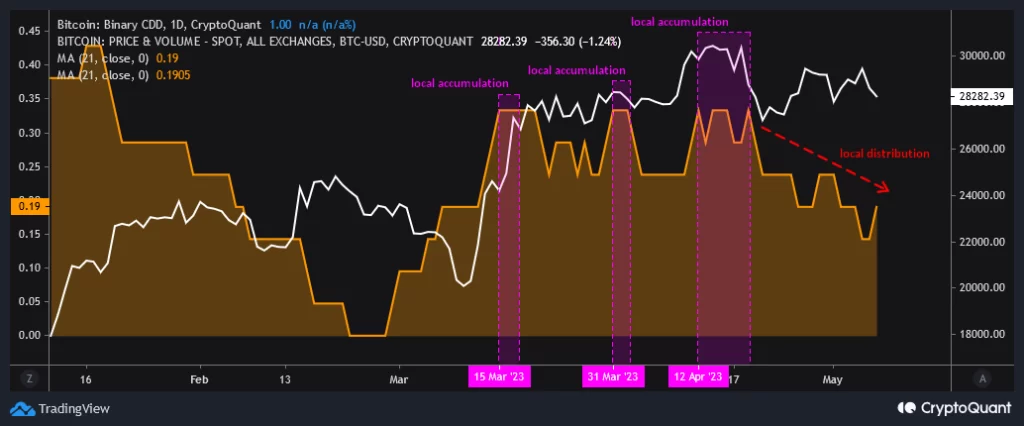 Baro’s conclusion was based on a rating of BTC’s Coin Days Destroyed (CDD) on a 21-day moving average. This metric tracks the number of cryptocurrency coins that have been inactive for a period of time and then suddenly moved.