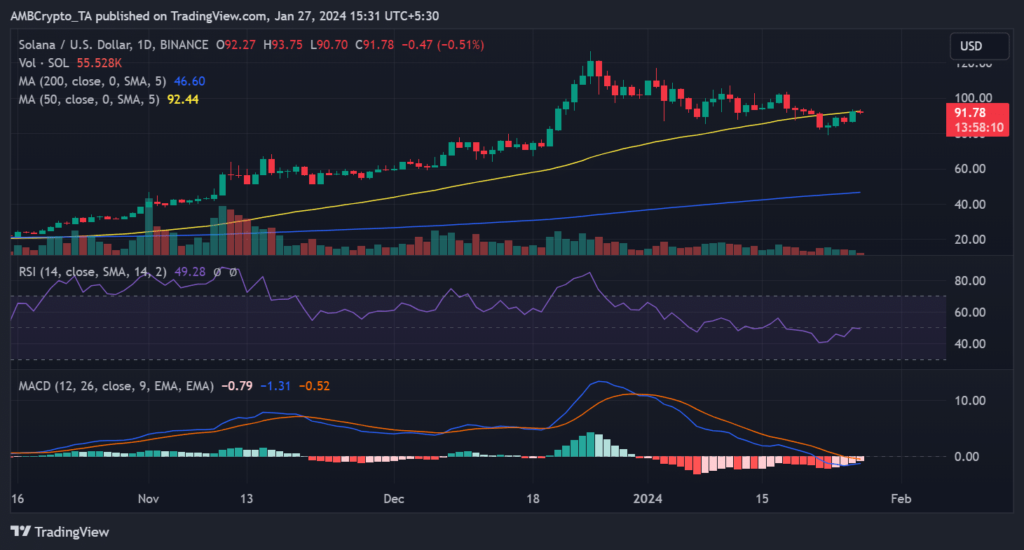 However, at the time of writing, the uptrend has paused, with a slight decline observed, and SOL was trading around $91.8.