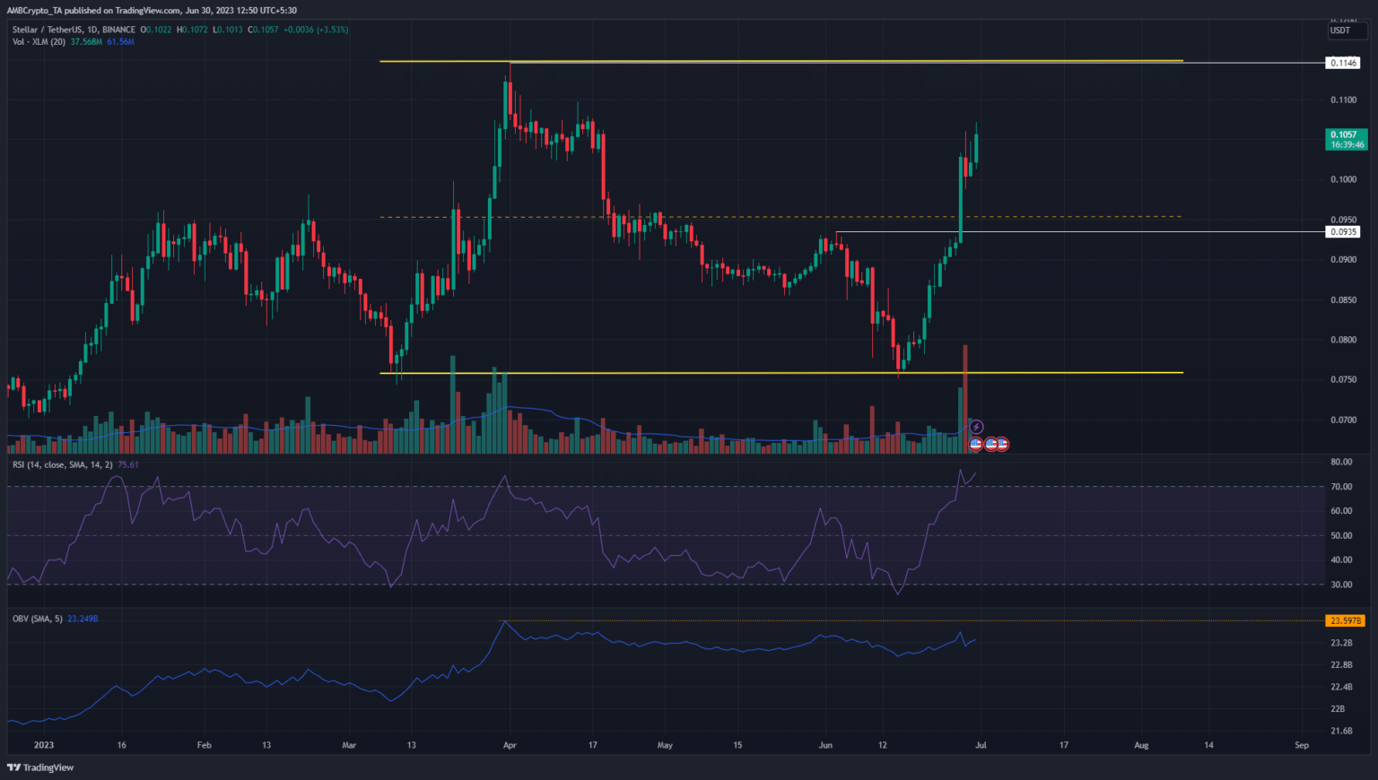 The $0.0935 level represented the previous low on XLM’s one-day price chart. The price broke past this level on June 27 and did so with huge trading volume. The pump continued for the past two days with no retracement.