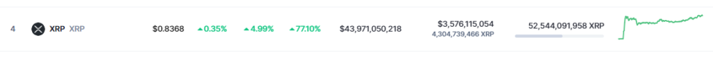 Crypto market tracker data CoinMarketCap shows that XRP is trading at $0.8368, with an impressive 5% increase in the last 24 hours. In the past seven days, the crypto has experienced a significant increase of just over 77%.