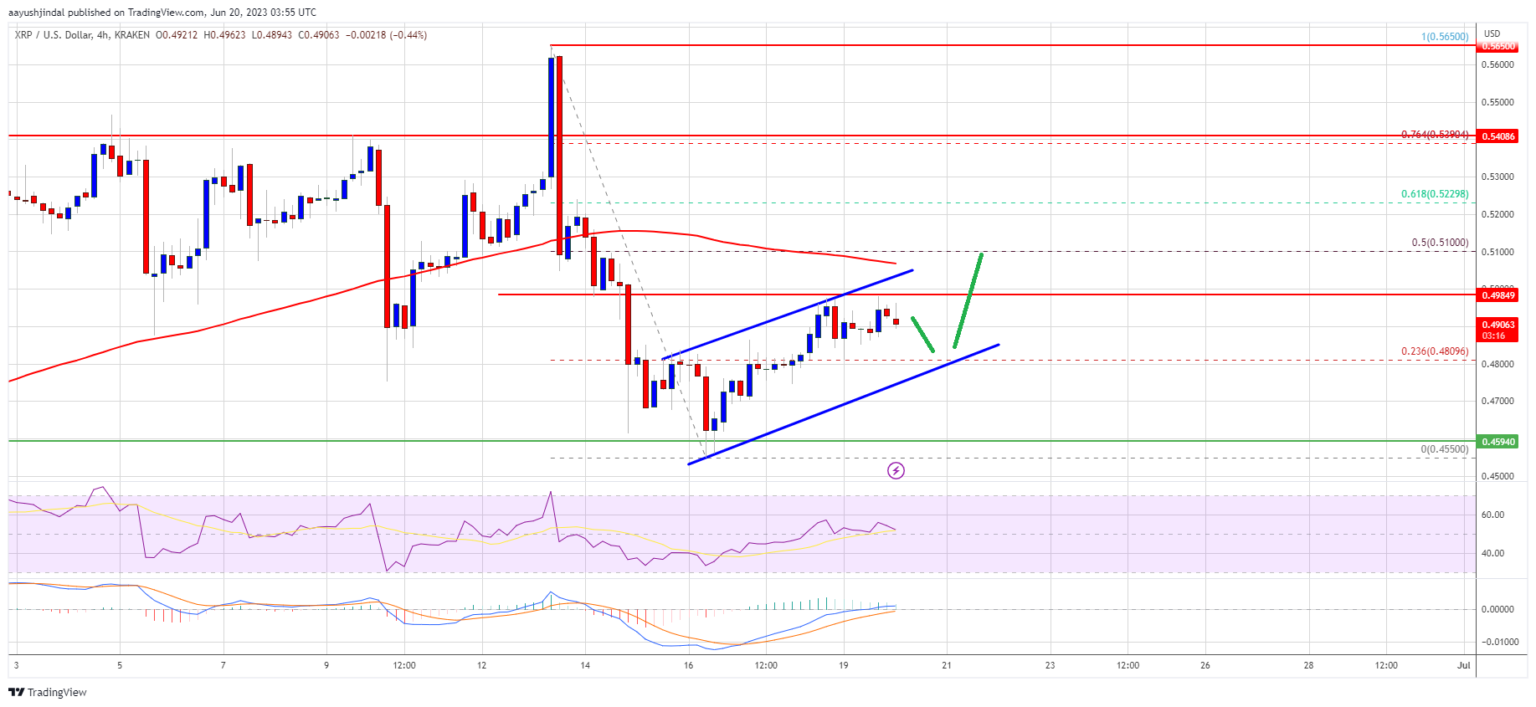 The price even spiked below the $0.480 support zone. A low was formed near $0.4550 and the price is now rising. There was a decent rise above the $0.4650 and $0.480 resistance levels. XRP surpassed the 23.6% Fib retracement level of the downward move from the $0.5650 swing high to the $0.4550 low.