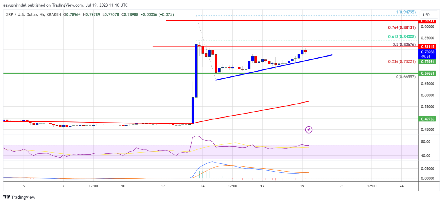 Ripple’s token price rises from $0.6650 against the US dollar. XRP price could gain bullish momentum if it clears the $0.8065 resistance zone.