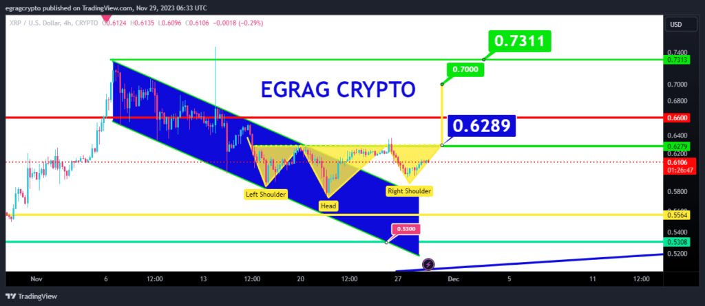 This pattern is indicative of a bearish trend losing momentum and a potential bullish reversal if the pattern completes. Egrag’s analysis points to key price levels to watch, with the neckline of the inverse H&S pattern at around $0.6289.